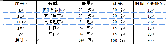 試卷題型分為五個部分:詞匯和結(jié)構(gòu)、完形填空、閱讀理解、翻譯(漢譯英)和寫作??荚嚂r間總計 90 分鐘,滿分為 100 分,達到 60 分為合格。試卷內(nèi)容結(jié)構(gòu)如下: