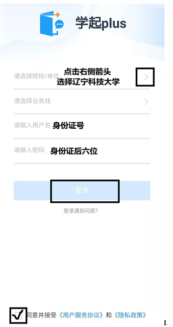2、進(jìn)入app后,選擇遼寧科技大學(xué),輸入用戶名、密碼,并同意政策